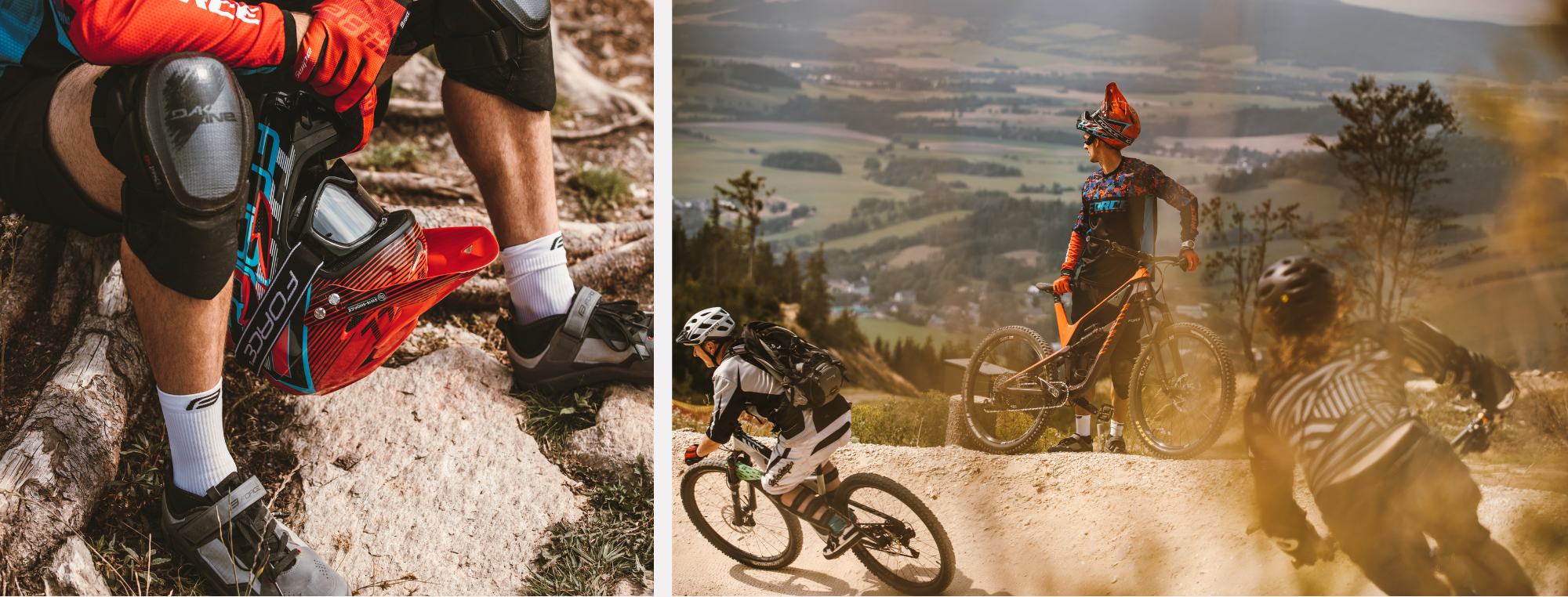 Doplň ji downhillovými brýlemi FORCE nebo GRIME, které ochrání tvůj zrak a jejich pěnová vrstva absorbuje pot a filtruje nečistoty. Do bike parku absolutní nezbytnost. A myslet bys měl i na své nohy - tretry DOWNHILL a FREERIDE byly speciálně navrženy pro jízdu v drsném a technickém terénu.